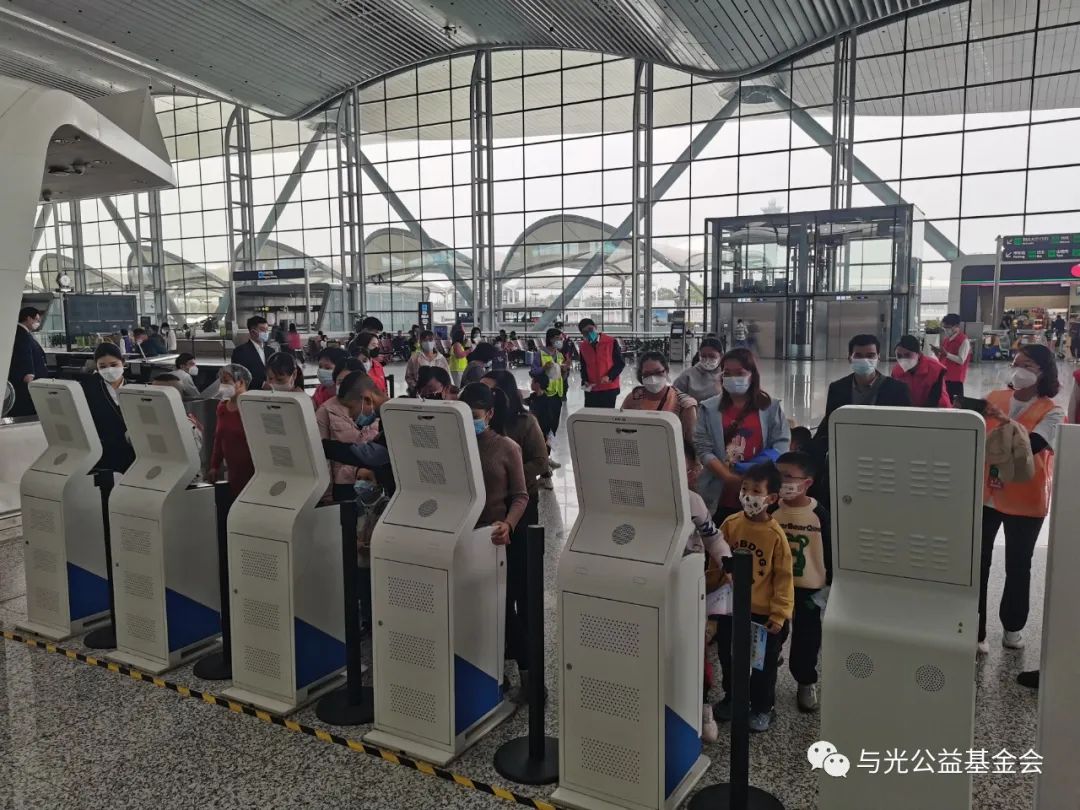 在与光公益慈善基金会志愿者的带领下,小朋友们首先参观了白云机场T2航站楼,听讲解员介绍值机办理手续、乘机流程等,体验智慧出行的便捷服务。来到值机柜台前,志愿者为小朋友办理爱心登机牌,提醒孩子们带好行李,准备出发。